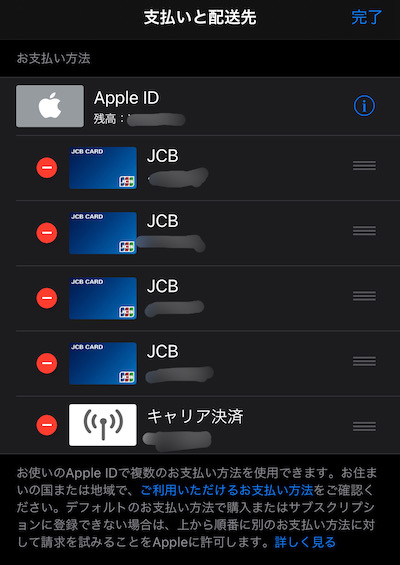 「設定」→「Apple ID、iCloud、メディアの購入」(一番上)→「お支払いと配送先」