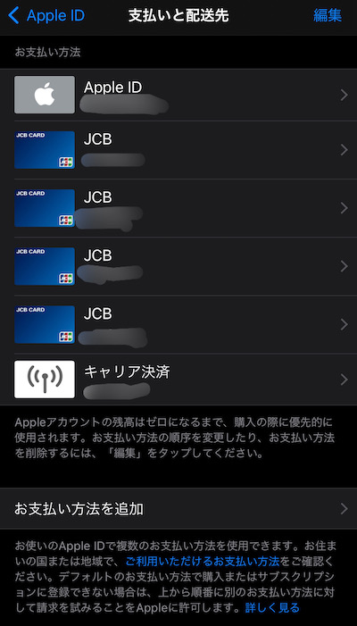 1枚目のチャージが終わったら「支払いと配送先」に戻って右上の「編集」をタップしてカードの順番を入れ替えよう