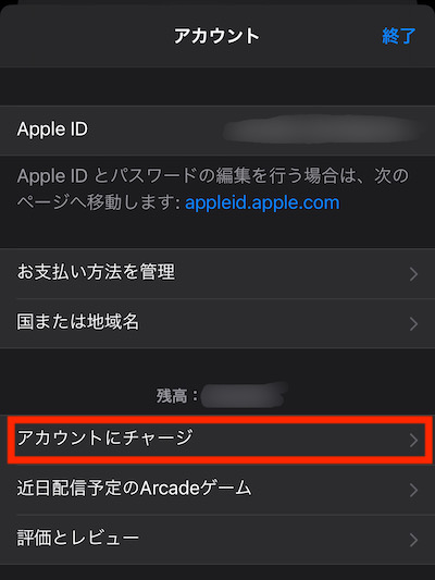 登録が終わったら「iTunes」の一番下のアカウントをタップし「アカウントにチャージ」で残高を5,000円を追加しよう