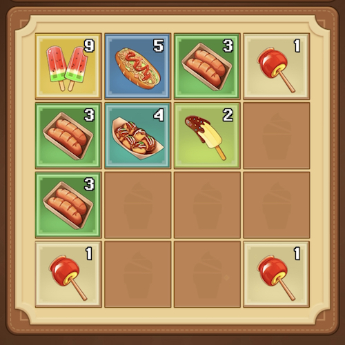 屋台めぐりはスライドさせて同じパネルを合わせるとレベルアップし、パネルが動かせなくなるまで合成させていくパズルゲームです