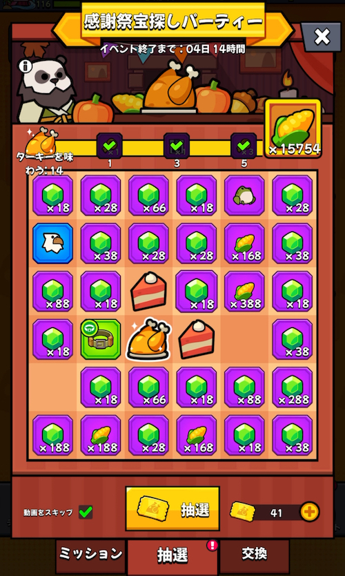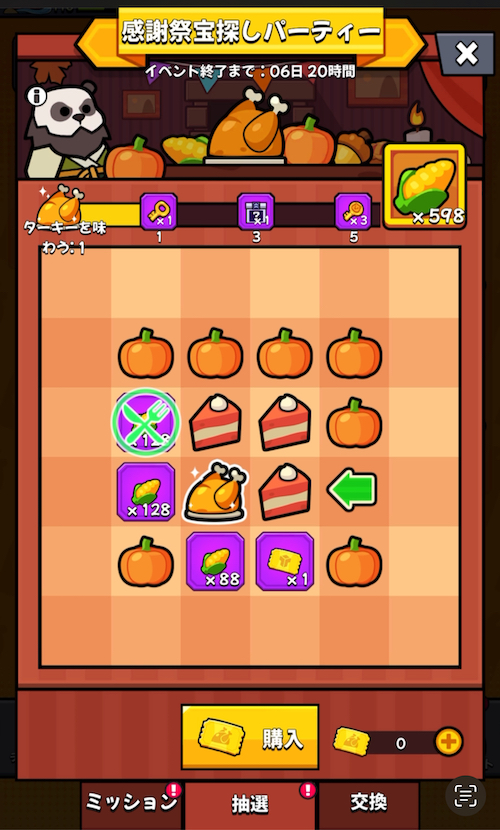 ミッションで手に入れた「ターキークーポン」を使用して抽選し、商品をゲットしましょう