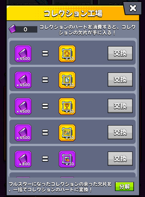 そしてガチャを引きまくって被ったコレクションは分解してハートに変換し、ハートでコレクションの欠片と交換できます