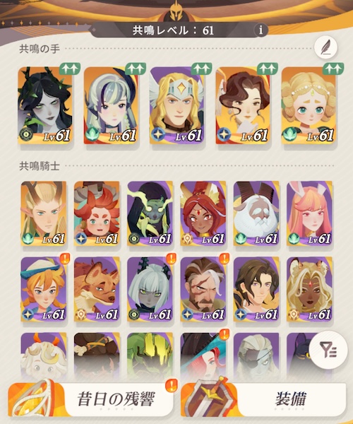 このゲームは「共鳴の手」という”キャラクター5枠”のレベルを上げるというシステムになっています