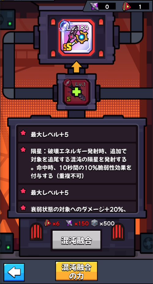 - 隕星:破壊エネルギー発射時、追加で対象を追尾する混沌の隕星を発射する。