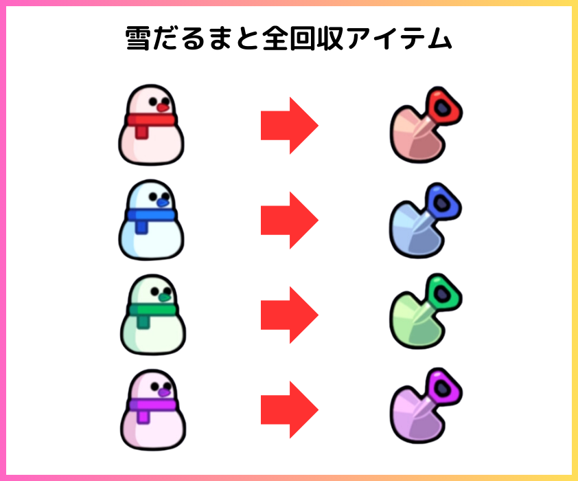 - シャベル(4色):同じ色の雪だるまをすべて回収