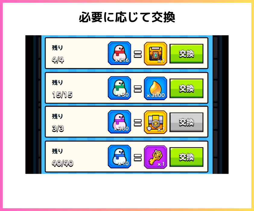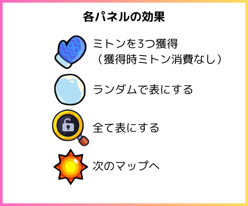 - ミトン:獲得すると手持ちのミトンが+3、しかも消費なし