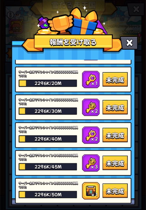 全プレイヤーの進行状況に応じて、鍵や金コレクションなどがもらえるよ。