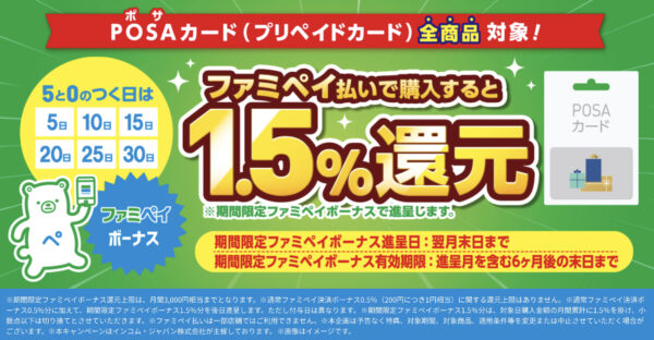ファミマは5と0のつく日にファミペイで購入すると1.5%還元されるキャンペーンもあるからお得だよ