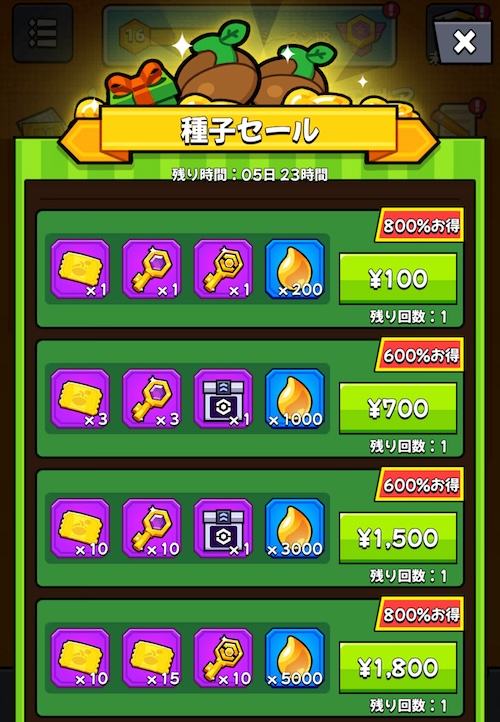 前回と同じなら、種子クーポンは1つ200ジェムで購入できるから、最終日に累計報酬を見て調整で買う感じかな