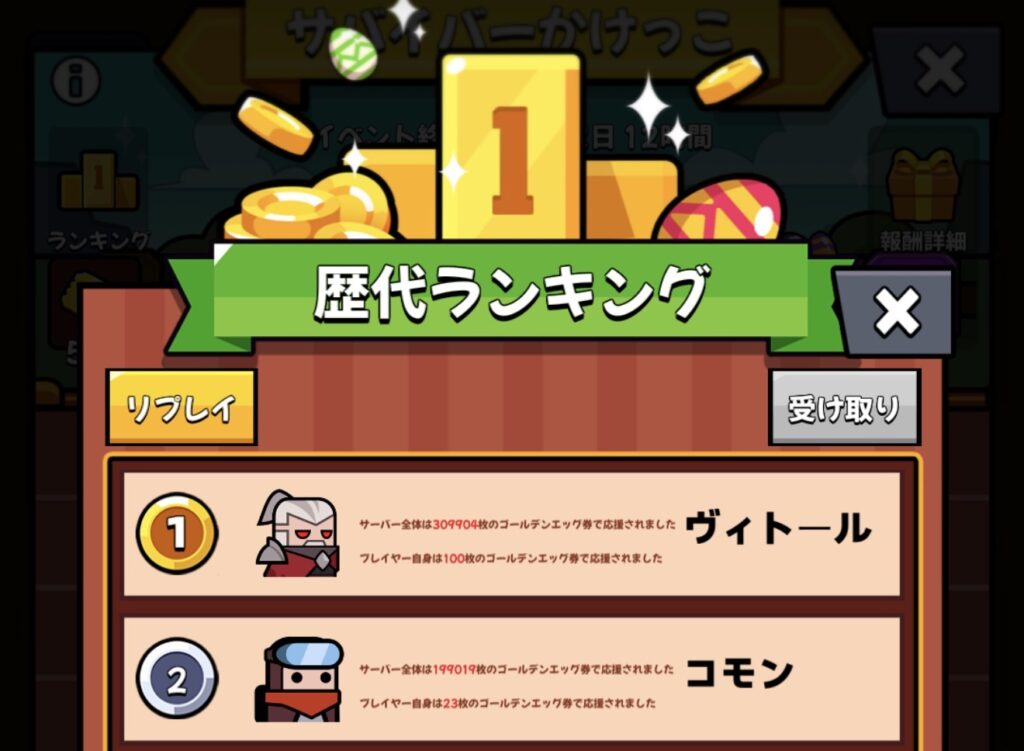 おお!リーク情報通り、1位になるサバイバーに100枚投入して見事に報酬ゲットだね!