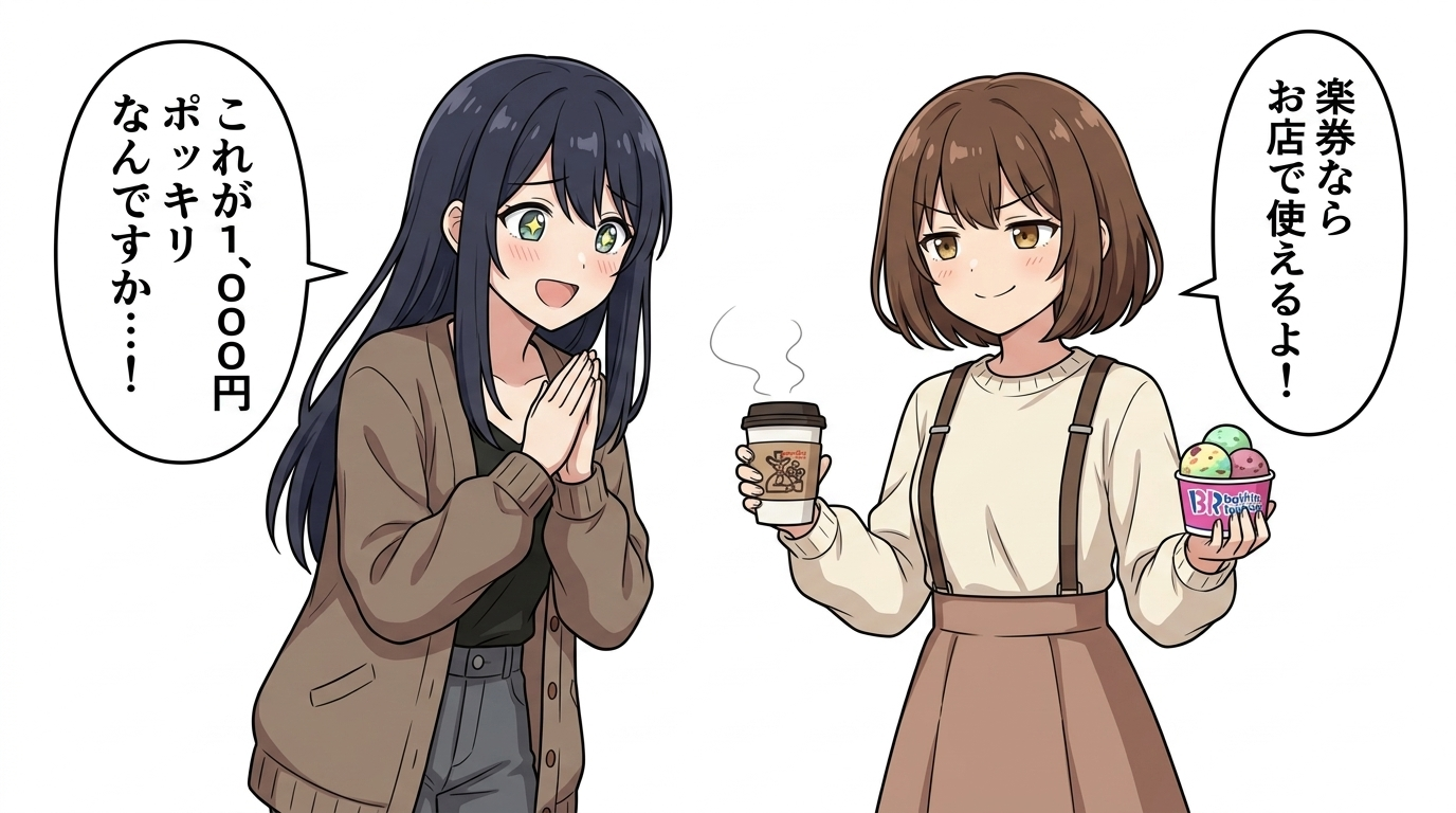 コメダとサーティワンを両方買っても、楽券は1ショップ扱いで1カウントのみ。複数買うなら「楽券+別ジャンル商品」のように組み合わせるのがコツだよ。